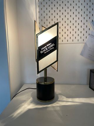 Particolare lampada pubblicitaria whisky Johnnie Walker anni 80 con base molto pesante in metallo e tre vele in ottone con inserti in plexiglas che fungono da paralume. E’in buone condizioni e funzionante,presenta qualche segno del tempo sulle parti in ottone,un plexiglas presenta una colatura sul bordo poco visibile. Lampada molto bella e d’effetto. E’alta circa 45cm