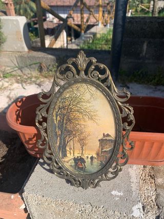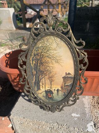 Bellissimo quadretto antico con cornice in ottone, raffigurante una scena invernale con pattinatori sul ghiaccio. - Cornice in ottone finemente lavorata. - Soggeto: paesaggio invernale con alberi spogli e casa. - Stile: classico/vintage.