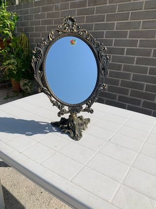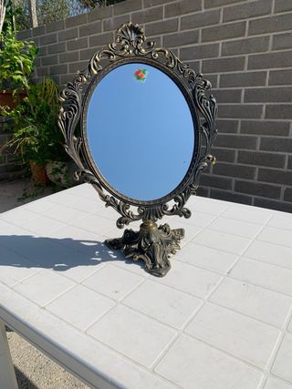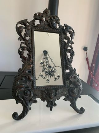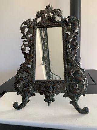 Elegante specchio da tavolo antico con una bellissima cornice in bronzo finemente lavorata. - Cornice in bronzo con dettagli decorativi. - Design classico e raffinato. - Base stabile per appoggio.
