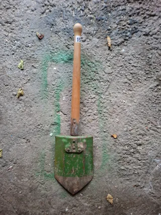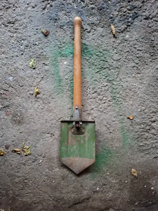 Vanghetta militare pieghevole, utile per diverse attività all'aperto. - Manico in legno. - Pala in metallo verniciato di verde.