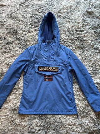 Giacca a vento Napapijri di colore blu. - Cappuccio con coulisse. - Tasca frontale a marsupio. - Patch logo Napapijri. - Bandiera Norvegese applicata.