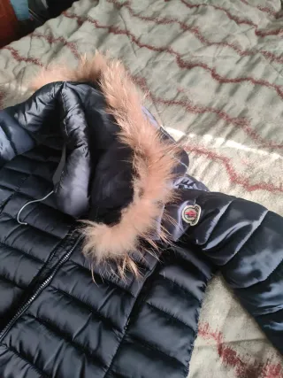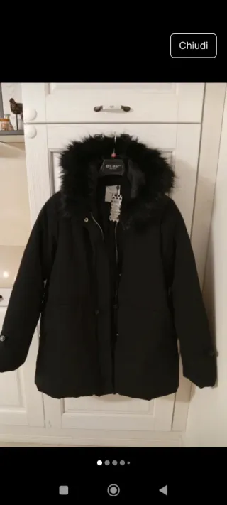 Bellissimo piumino con cappuccio bordato in pelliccia sintetica. - Chiusura frontale con zip. - Tasche laterali. - Polsini regolabili.Taglia L .Nuovo con cartellino.Caldo e pratico
