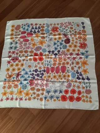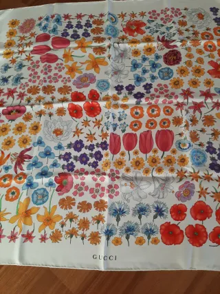 Elegante foulard Gucci in pura seta, con un vivace motivo floreale. - Fantasia floreale multicolore su fondo bianco. - Touch setoso e leggero. - Logo Gucci stampato. - Etichetta Gucci. - Misura cm.86x86 - Orlo rifinito a mano
