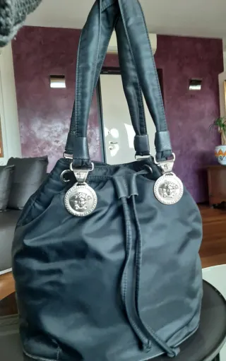 Borsa tote Gianni Versace in tessuto nero, un pezzo vintage. - Iconico medusa in metallo argentato. - Chiusura con coulisse. - Manici in pelle e tela. - Dettagli in metallo argentato. - Misura altezza cm.31 più 28 di manico. - Larghezza cm.37,5 aperta e adagiata. -Fondo larghezza cm. 21, lunghezza cm. 28. Segnalo: - bordo in pelle a livello del fondo usurato. per rifarlo il costo è di circa 25 euro. - Posteriormente è presente un piccolo taglio della tela. Guardate tutte le fotografie.