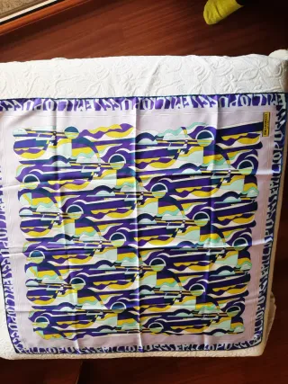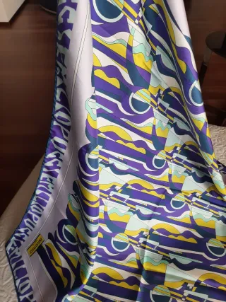 Foulard in pura seta con un vivace motivo geometrico. - Motivo Opus di Emilio Pucci. - Composizione: 100% Seta. - Orlo rifinito a mano - Made in Italy - Misura cm. 89x90 - Bordo caratterizzato dalla scritta Emilio Pucci sui 4 lati. Segnalo 1 lato del foulard con segni di una spilla e 2 impercettibili segni della seta. Vedi fotografie.