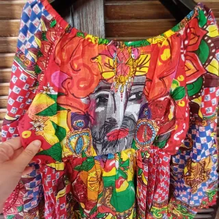 Vestito Kariza multiwear, versatile e unico. - Taglia unica. - Fantasia multicolor con dettagli rossi. - Design multiuso per diverse occasioni.