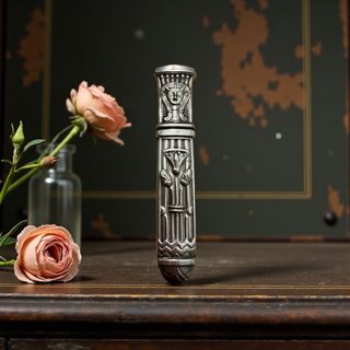 Porta aghi antico in argento massiccio 800, punzonato testa di cinghiale (garanzia francese). Produzione dei primi decenni del ’900, in stile Egyptian Revival / primo Art Déco. Decorato con volto egizio stilizzato, colonne e fiore di loto, simboli di ordine e rinascita, molto apprezzati nel gusto dell’epoca. Oggetto raffinato e funzionale, pensato per custodire gli aghi da cucito con eleganza. Lunghezza 6,6 cm – peso 4,5 g. Buone condizioni, con patina coerente con l’età. Ideale per collezionisti o amanti del cucito d’epoca.