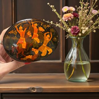 Caja ovalada antigua de papier-mâché lacado y pintado a mano, procedente de Srinagar, Cachemira (India). Decoración figurativa con personajes y caballos en movimiento, típica de la tradición artesanal de la zona. Conserva etiqueta original “B. Dar & Co., Rainawari – Srinagar”, lo que permite fecharla aproximadamente entre los años 30 y 50 del siglo XX. Pieza decorativa auténtica, ideal como joyero o caja de pequeños objetos. Medidas: 10,5 × 8 cm, altura 4,2 cm.