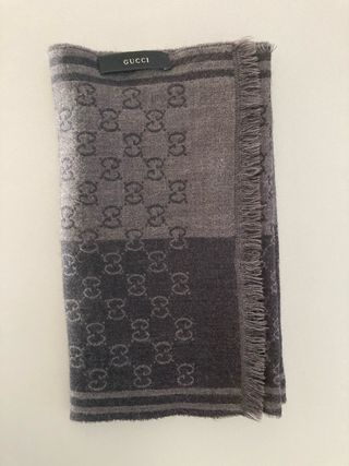 Elegante sciarpa Gucci con iconico motivo GG. - Motivo GG all-over. - Tonalità grigie. - Orlo sfrangiato. Il prezzo e’ basso perché in alcuni punti la sciarpa ha perso dei fili di lana, come da dettagli nelle foto.