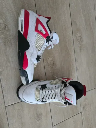 Scarpe Jordan 4 Red Cement. Design iconico con dettagli rossi e bianchi. - Tomaia in pelle bianca. - Inserti in rete traspirante. - Dettagli rossi a contrasto.