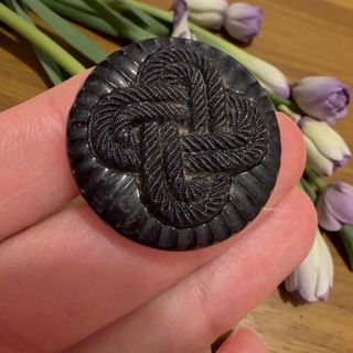 Conjunto original de 3 botones joya antiguos en French jet (vidrio negro), finales del siglo XIX – principios del XX. Decoración en relieve con motivo de nudo, símbolo de unión y continuidad, y borde estriado. Vetro negro macizo, con buen peso y excelente definición del dibujo. Muy buen estado de conservación; leve marcas coherente con la antigüedad. Se conservan unidos por el hilo original. Ideales para colección, restauración de prendas antiguas o uso decorativo. Se venden solo juntos.