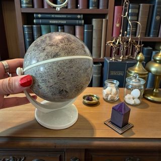 Globo lunar de escritorio de principios de los años 90, con marcado CE de los primeros años de obligatoriedad. Superficie detallada con nomenclatura astronómica y misiones Apolo. Gira completamente en ambos ejes, horizontal y vertical. Material sólido y de buena calidad, no plástico ligero. Altura aproximada: 14 cm. Objeto decorativo y didáctico, ideal para escritorio, biblioteca o estudio. Pieza sobria, científica y elegante, propia de una época previa al diseño digital actual.