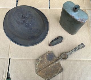 Lotto di oggetti militari inglesi della Seconda Guerra Mondiale rinvenuti sulla linea gustav. - Elmetto in metallo - Borraccia in metallo - Coltello pieghevole - zappetto