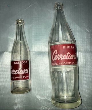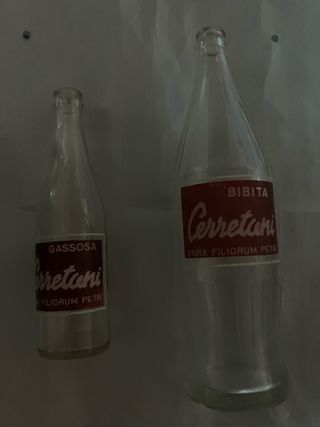 Due bottiglie di vetro vuote, con etichetta Cerretani. - Una bottiglia riporta GASSOSA. - L'altra bottiglia riporta BIBITA. - Entrambe le etichette presentano la scritta FARA FILIORUM PETRI.
