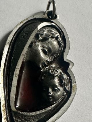 Ciondolo vintage raffigurante la Madonna con Bambino. - In peltro con dettagli in smalto bordeaux - Dettagli in rilievo.
