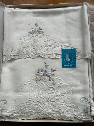 Elegante set di asciugamani vintage in puro lino, con ricami floreali e dettagli in pizzo. - Ricami floreali colorati. - Bordi con intaglio - Tessuto in puro lino. - 3 asciugamani grandi - 3 bidet