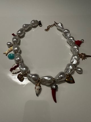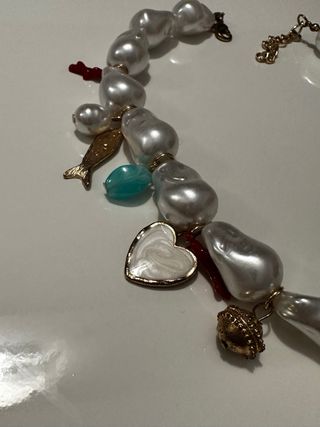 Collana con perle barocche sintetiche e ciondoli a tema marino. - Perle di grandi dimensioni. - Ciondoli a forma di pesce, conchiglia, corno rosso e altro. - Chiusura a moschettone. Pari al nuovo.