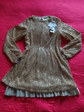 Bellissimo abito I Do nuovo con cartellino, perfetto per occasioni speciali. - Colore oro scintillante con paillettes. - Taglia XXL (corrisponde a 14-16 anni). - Maniche lunghe. - Dettaglio sottoveste con balza.