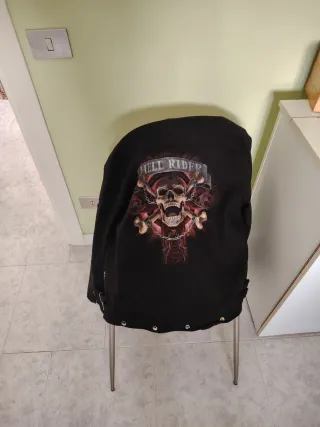 Chiodo in tessuto con stampa Hell Rider sul retro. - Stampa con teschio, ossa e catene. - Dettagli con borchie sul fondo. - Inserti regolabili sui fianchi.