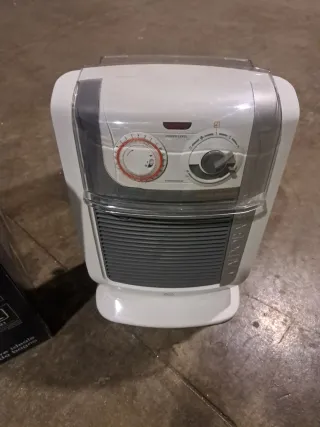 Termoventilatore DeLonghi Caldobagno, ideale per la stanza da bagno. Design compatto e funzionale. - Colore bianco e grigio. - Manopole per impostazioni. - Griglia frontale. - 3 velocità - programmabile su partenza e spegnimento