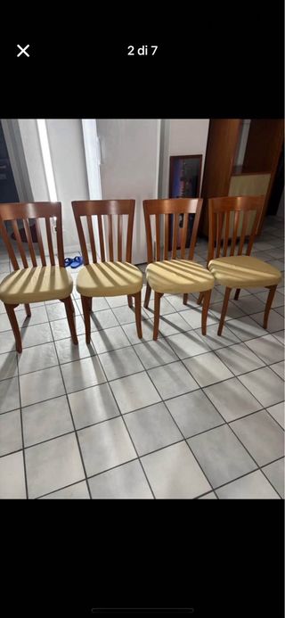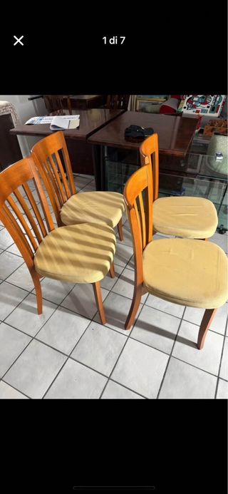 Set di quattro sedie con struttura in legno e seduta imbottita in tessuto. - Design classico e versatile. - Seduta confortevole. - Ideali per sala da pranzo o cucina.