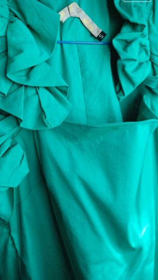 Vestito corto con dettagli a volant sulle spalle. - Scollo rotondo. - Maniche corte. - Tessuto leggero. In cotone morbido