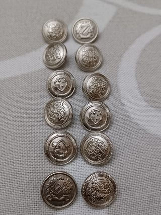 Set di bottoni vintage con un design elaborato e dettagli intricati. Perfetti per aggiungere un tocco di classe a capi d'abbigliamento o accessori. - Design con stemma e motivi decorativi. - Finitura lucida. - Bordo lavorato a cordoncino. Diametro 1,6cm