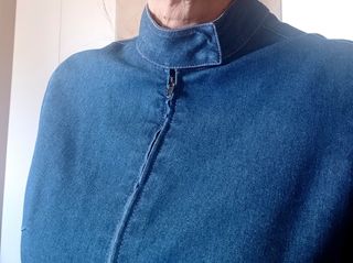 Giacca in denim con un design ispirato alla moda coreana. Presenta un colletto alto e una chiusura a zip. - Tessuto denim resistente. - Colletto alla coreana. - Chiusura frontale con zip.