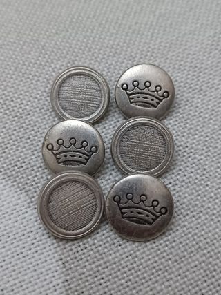 Set di sei bottoni vintage con un design a corona. - Dettaglio a corona inciso. - Finitura in stile argento. - Motivo a trama incrociata su alcuni bottoni. Diametro 1,1 cm