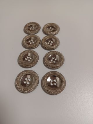 Set di bottoni eleganti con finitura lucida e bordo lavorato. - Materiale: Metallo - Colore: Argento - Quantità: 8 bottoni - Design: Bordo con motivo a grana di riso