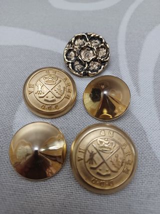 Set di cinque bottoni vintage in color oro. - Un bottone con decorazione floreale. - Quattro bottoni con stemma e scritte. - Due bottoni lisci e bombati.