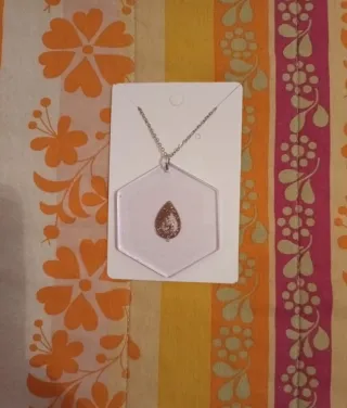 Ciondolo unico realizzato in resina trasparente con un ciondolo all'interno. - Forma esagonale. - Ciondolo a forma di goccia. - Catena in metallo color argento. Misure ciondolo: larghezza 4,5, h 5 cm. Misure catenina: 19 cm+ 5 cm di lunghezza regolabile. Con confezione regalo.