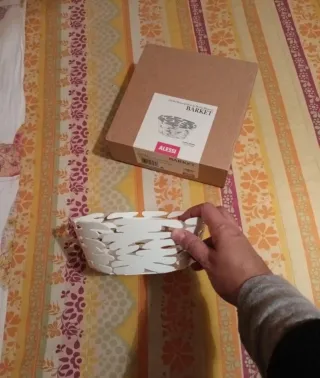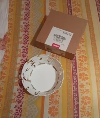 Elegante cestino rotondo in acciaio verniciato bianco Alessi Barket, perfetto per ogni ambiente. - Design moderno e traforato. - Realizzato in metallo di alta qualità. Misure: diametro 18 cm, h 6,5 cm
