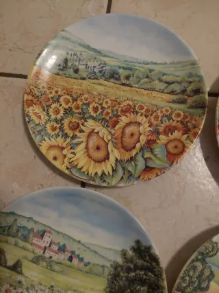 Bellissimo set di 4 piatti decorativi in ceramica Limoges, perfetti per aggiungere un tocco di eleganza alla tua casa. - Ogni piatto presenta un paesaggio floreale dipinto a mano. - Motivi inclusi: girasoli, papaveri, margherite e lavanda. - Diametro di ogni piatto: [inserire diametro se noto]. - Ideali come pezzo da collezione o per decorare pareti.