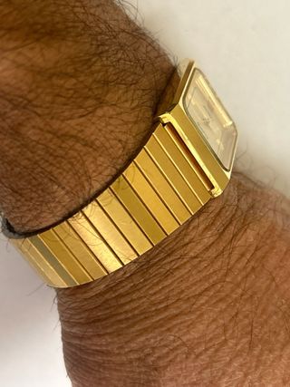 Elegante orologio da polso con cassa e cinturino color oro. NOS - Quadrante rettangolare. - Movimento al quarzo. - Cinturino a maglie. Larghezza mm 23
