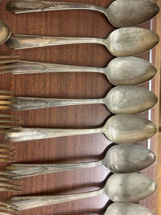 Set di posate vintage americane risalenti agli anni '30 e '40. Un tocco di eleganza retrò per la tua tavola. 20 cucchiai 20 forchette grandi 6 forchette piccole - Design classico e raffinato. - Materiale metallico resistente.