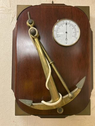Bellissimo set di arredamento nautico con un'ancora decorativa in ottone e un termometro. - Base in legno scuro. - Dettagli in ottone. - Termometro con scala in Celsius e Fahrenheit. Su possono lucidare le parti in ottone ancora ed i lati del riquadro