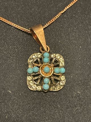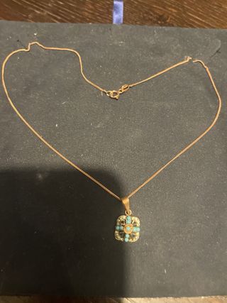 Elegante collana con pendente a forma quadrata, impreziosita da dettagli luminosi Swarovski e pietre turchesi naturali - Design unico con pietre turchesi. - Cornice decorata con cristalli Swarovski - Catena sottile color oro in argento 925 lunga cm.44