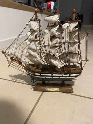 Bellissimo modellino di nave A. Vespucci in legno, perfetto per gli appassionati di nautica. - Dettagli curati delle vele e degli alberi. - Base in legno con targhetta identificativa. - Bandiera italiana in cima all'albero maestro misure base cm.12, larghezza vele cm.26, altezza cm.25
