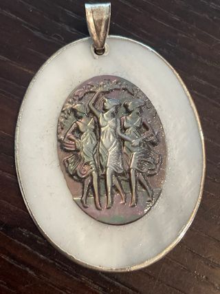 Elegante pendente con una base in madreperla e una decorazione centrale. - Decorazione con tre figure femminili. - Base ovale in madreperla. - Montatura in argento 925