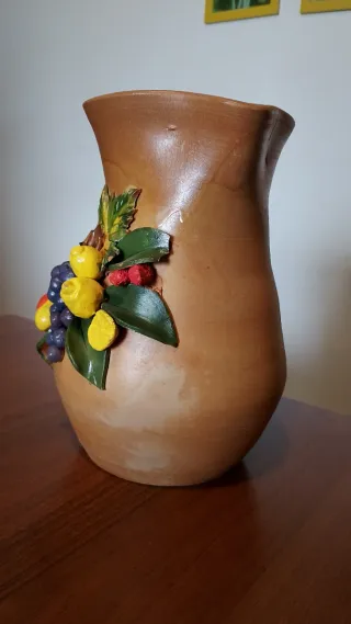 Elegante brocca in ceramica vintage, alta 27 cm, con decorazioni a rilievo. - Motivo floreale e fruttato. - Manico robusto. - Finitura color terra. - Design unico e artigianale. Non presenta crepe strutturali; normali segno del tempo compatibili con l'età (vedi foto) prezzo trattabile