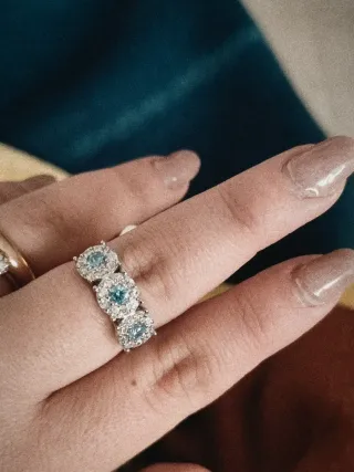 Elegante anello con tre pietre centrali di colore blu, incastonate in una montatura color argento. - Design a tre pietre. - Dettagli scintillanti attorno alle pietre centrali.