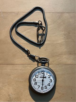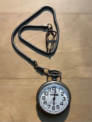 Orologio da taschino Omixox vintage con catenella. - Cassa in metallo. - Quadrante bianco con numeri neri. - Lancette nere. - Catenella in metallo con clip.