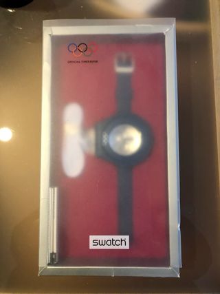 Orologio Swatch Cronografo edizione limitata Olimpiadi Atene 2004. - Cassa e cinturino blu. - Quadrante color argento con dettagli dorati. - Logo delle Olimpiadi presente sul quadrante.