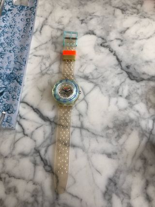 Orologio Swatch Scuba Jelly Bubbles del 1992, un pezzo da collezione. - Design trasparente con dettagli colorati. - Quadrante a vista. - Cinturino in plastica con fori. - Scatola originale inclusa.