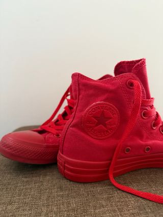 Iconiche scarpe alte Converse All Star in un vivace colore rosso. Perfette per un look casual e di tendenza. - Tomaia in tela resistente. - Chiusura con lacci. - Suola in gomma. - Patch logo rotondo sul lato.