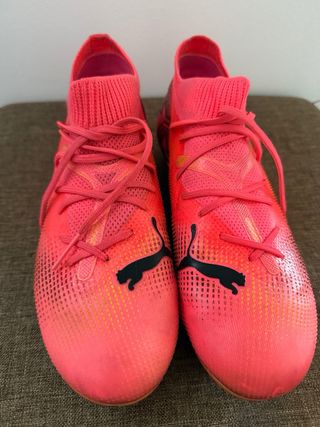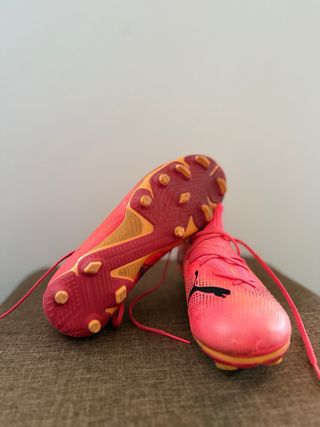 Scarpe da calcio Puma con un design vivace. - Colore principale rosso con dettagli arancioni. - Suola con tacchetti per il campo.
