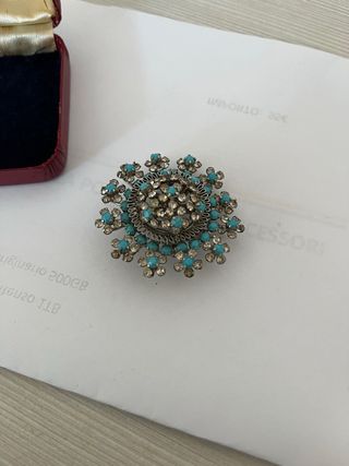 Bellissima spilla antica di origine inglese, un gioiello che aggiunge un tocco di eleganza. - Design floreale elaborato. - Incastonata con piccole pietre turchesi. - Dettagli in cristalli luminosi.