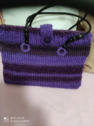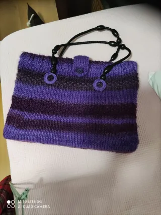 Borsa a mano realizzata a mano con filato di lana a righe. - Chiusura con bottone. - Manici con perline nere. - Dettagli con bottoni circolari.