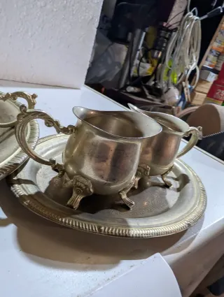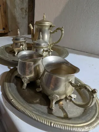 Vendo set antico in peltro composto da teiera, zuccheriera, lattiera e vassoio, più due tazzine con piattino. Pezzo originale con patina del tempo, ideale per appassionati di oggetti d’epoca, collezionismo o come elemento decorativo elegante per la casa. ✨ Dettagli: • Materiale: peltro/vetro (verifica punzoni se presenti) • Ottimo come oggetto da esposizione o per veri intenditori • Alcuni segni d’uso coerenti con l’età dell’oggetto 📬 Spedizione disponibile, consegna a mano possibile.